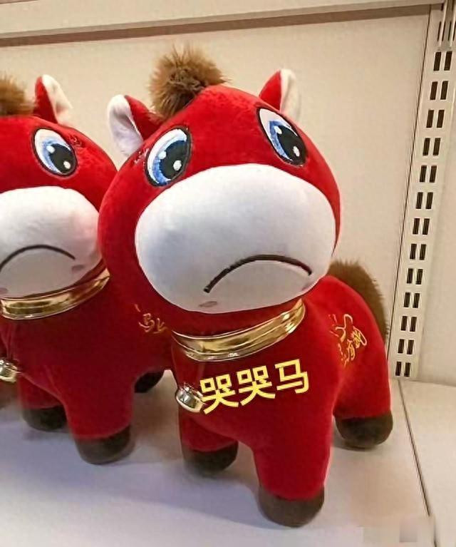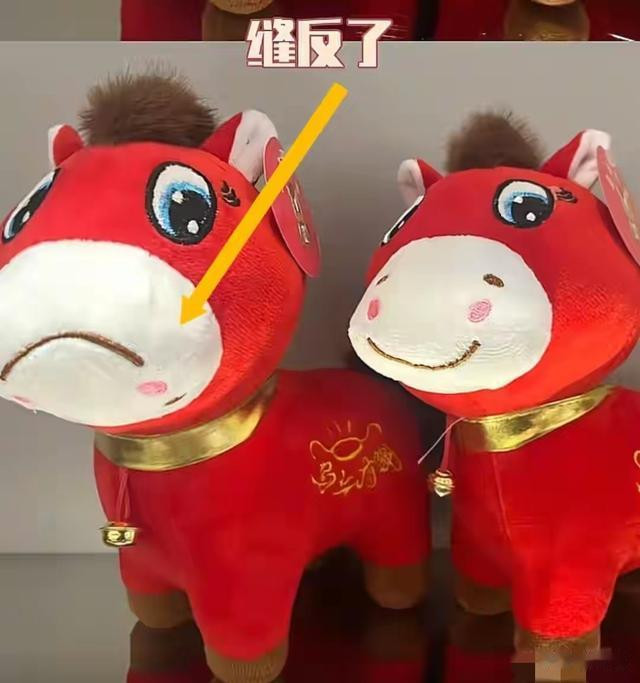 本来设计稿上画的是一只喜气洋洋的祥瑞小马,嘴巴高高翘起,寓意新年吉祥。哪成想工厂里的工人师傅手一抖,嘴巴位置没拿捏准,直接缝到了下巴底下,连带着腮红、鼻孔顺势一路下滑,硬生生把一张笑脸缝成了哭脸。